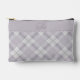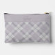 This cosmetics pouch or accessory bag features a grey and lavender plaid pattern with a wide lavender stripe across the top for a personalised name. Change the name right on the product page to make it your own!