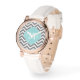 Elegant and chic watch design features a modern zigzags pattern, an elegant quatrefoil or clover shaped frame, and a three letter monogram.