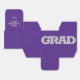 GRAD in bold grey lettering wraps around the front of these purple 2" square graduation party favour boxes with your name and thank you message on the top.