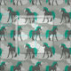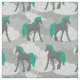 Features a pattern of stately unicorns in dark charcoal grey with teal green manes and tails set against a background of swirling grey clouds.