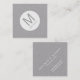 Grey and white modern minimalist professional design featuring grey monogram and name on white circle element with business information in white professional sans serif font style on grey paper.