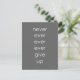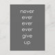 This simple yet sophisticated postcard provides great words of advice and inspiration. The postcard reads, “never ever ever ever give up”. This postcard has a grey background and the text is printed in a clean, white sans serif font. These are great gifts of inspiration to those struggling with illnesses, or hard times. These are also great for general correspondence. I have also seen these motivational cards framed and displayed on office walls and desks. Give as a gift, or keep for yourself. How you want to use it is entirely up to you! Zazzle postcards are great quality, and extremely affordable. The postcard measures 5.6" x 4.25" inches on high quality cardstock paper. Please send me a message if you have any questions or concerns regarding the design.