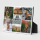 Honour your beloved dog who's passed away with this dog memorial plaque personalised with a photo collage of six photos, with paw prints and angel wings, their name and years living, and a quote or personal text in black fonts against a grey background.