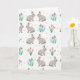 Designed with a repeating spring pattern, this card features stylized long-eared rabbits in soft gray, with blush-pink inner ears and tiny rosy cheeks 🐰. Some pairs face each other with a tender, friendly lean, as if sharing a quiet secret, while others look outward to invite the viewer in. Between them sit clusters of spring flowers, including closed pink blooms touched with yellow and small lavender blossoms that feel gently fresh 🌷. Several of the purple flowers are framed by a faint pale-blue circle, like a soft halo of morning dew. The background stays very light, letting the pastel animals and flowers stand out without feeling busy. Small polka dots in yellow, light blue, and pink are scattered throughout like confetti or new buds. No headline text appears, leaving the pattern to fill the front with rabbits, flowers, and dots evenly spaced across the surface.