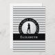 This custom design features a female golfer silhouette set on a realistic golf ball image. The golf ball is placed on a black circle that is bordered with curved text "GOLF GOLF GOLF GOLF" in white font. A black band holds a template for a monogrammed name or custom text. The background is a trendy ultimate grey and white stripe pattern. Blank on back, this card is perfect for your personal handwritten note.