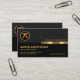 Just above the gold stripe is the business name with a faux gold number "pi" logo you can use, at the top left corner. The black layer below has your prestigious name, job title and the contact details. A slogan option to publicise your services is at the lower right corner.