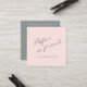 Blush background referral card with graphic white stripes and elegant font, back side grey with serif font and all information.