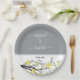Grey branch with yellow flowers and initials wedding paper plate. The upper part is covered with an ultimate grey band and your initials in script typography while the bottom part is of white colour with a grey and black branch with illuminating yellow flowers.