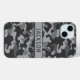 Customise this grey camouflage iPhone 15 plus case with your name in a trendy modern CAP font in dark grey on light grey. It's masculine and perfect for your favourite military, hunting, country or outdoorsman!