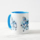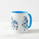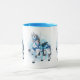 I have loved carousels since I was a child. The beautiful designs of the animals and music from carousels set up at fairs and parks hold a special place in my heart. This inspired me to draw some carousel horses of my own, then colour them with acrylic ink. The watercolor of a grey horse decorated in blue featured on this mug is one of the results.