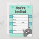 Funny grey kitty cat poking his head out from the bottom right corner. He has a white belly big round eyes and pink ears. The background is a light mint colour with three light blue stripes that have a dark blue outline, templates to add your party details ate in a white box on the front of the invitation.