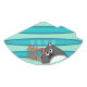 Funny grey kitty cat poking his head out from the bottom right corner. He has a white belly big round eyes and pink ears. The background is a light mint colour with three light blue stripes that have a dark blue outline. Party Time is above the cat in orange lettering.