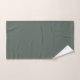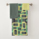 This towel set has a pale yellow washcloth, a light grey hand towel, and a bath towel with a mid-century modern design of rounded rectangles with ovals inside in retro shades of dark grey, pale yellow, and seafoam on a field of light grey. If you want the same design with different colours, message me.
