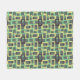 This medium fleece blanket has a mid-century modern design of rounded rectangles with ovals inside in retro shades of dark grey, pale yellow, and seafoam on a field of light grey. If you want the same design with different colours, message me.