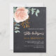 Chalkboard background. Decorated with a large rose gold and blush pink floral, rose flower and green watercolored eucalyptus leaves, sprigs, greenery and a faux gold sprig. Personalise and add your name and party details.