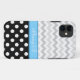 Stylish & sophisticated iPhone 5 case designed with a white polka dots over black pattern on the bottom, a 2-tone grey chevron zigzag pattern on the top, and personalised with your name or custom text in a white script font over a blue stripe.