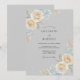 This design features a serene backdrop of soft grey adorned with delicate watercolor cream roses and clusters of light blue hydrangeas. The ethereal floral arrangements create a romantic and sophisticated atmosphere perfect for a seasonal event. Accents of sage green foliage and golden-hued leaves complete this elegant botanical aesthetic.