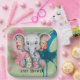 A baby cartoon elephant with a soft, rounded design and a playful demeanour. Its body is a light grey with large floppy ears and a short, curved trunk. The elephant is adorned with whimsical floral patchwork designs sewn across its body, featuring vibrant colours like pink, yellow, and blue. The patches have visible stitching around the edges, giving a handmade and cosy feel. Its wide, sparkling eyes convey a sense of innocence and curiosity, and it has rosy cheeks for an added touch of charm. The background is a watercolor Sage green, pink, and blue. Great for girls or boys.