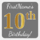 Grey, Faux Gold 10th Birthday + Custom Name Square Sticker