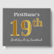 This guest book design features the ordinal number "19th" with a faux/imitation gold-like appearance. It also features a customised name, and a grey (grey) coloured background. It could be used at a birthday party for somebody who is celebrating their nineteenth birthday. [~Z0000193]