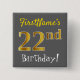This simple square button design features a message like "FirstName’s 22nd Birthday!", with the "22nd" having a faux/imitation gold-like colouring look, on a grey (grey) coloured background. The name can be personalised. Buttons like these could perhaps be worn by guests at a birthday party for somebody who is celebrating their twenty second birthday, where the party is being held in a large area with lots of other people present (such as a city park or a theme park). [~Z0000192]