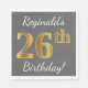 This simple paper napkin design features a message like "Reginald’s 26th Birthday!", with the "26th" having a faux/imitation gold-like appearance, on a grey (grey) coloured background. The name can be personalised. It could be used at a birthday party for somebody who is celebrating their twenty sixth birthday. [~Z0000190]