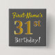 This simple square button design features a message like "First-Name’s 31st Birthday!", with the "31st" having a faux/imitation gold-like colouring look, on a grey (grey) coloured background. The name can be customised. Buttons like these could perhaps be worn by guests at a birthday party for somebody who is celebrating their thirty first birthday, where the party is being held in a large area with lots of other people present (such as a city park or a theme park). [~Z0000192]