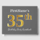 This guest book design features the ordinal number "35th" with a faux/imitation gold-like appearance. It also features a personalised name, and a grey (grey) coloured background. It could be used at a birthday party for somebody who is celebrating their thirty fifth birthday. [~Z0000193]