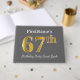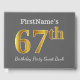 This guest book design features the ordinal number "67th" with a faux/imitation gold-like appearance. It also features a personalised name, and a grey (grey) coloured background. It could be used at a birthday party for somebody who is celebrating their sixty seventh birthday. [~Z0000193]