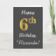 This simple birthday card design features the message "Happy 6th Birthday", with the "6th" having a faux gold-like appearance. It also features a custom name, and a grey background. It could be given to somebody who is celebrating their sixth birthday.
