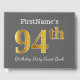 This guest book design features the ordinal number "94th" with a faux/imitation gold-like appearance. It also features a personalised name, and a grey (grey) coloured background. It could be used at a birthday party for somebody who is celebrating their ninety fourth birthday. [~Z0000193]