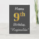 This simple birthday card design features the message "Happy 9th Birthday", with the "9th" having a faux gold-like appearance. It also features a custom name, and a grey background. It could be given to somebody who is celebrating their ninth birthday.