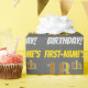 This wrapping paper design features a message like "FIRST-NAME’S 18th BIRTHDAY!", with the "18th" having a faux/imitation gold-like colour appearance, and with the name and "BIRTHDAY" in a fun, bold font. The name can be customised, and the background is coloured grey (grey). Wrapping paper like this could perhaps be used when wrapping birthday gifts being given to somebody in celebration of their eighteenth birthday. [~Z0000211]