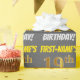 This wrapping paper design features a message like "FIRST-NAME’S 19th BIRTHDAY!", with the "19th" having a faux/imitation gold-like colour appearance, and with the name and "BIRTHDAY" in a fun, bold font. The name can be personalised, and the background is coloured grey (grey). Wrapping paper like this could perhaps be used when wrapping birthday gifts being given to somebody in celebration of their nineteenth birthday. [~Z0000211]
