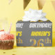 This wrapping paper design features a message like "ANDREW’S 26th BIRTHDAY!", with the "26th" having a faux/imitation gold-like colour appearance, and with the name and "BIRTHDAY" in a fun, bold font. The name is customisable, and the background is coloured grey (grey). Wrapping paper like this could perhaps be used when wrapping birthday gifts being given to somebody in celebration of their twenty sixth birthday. [~Z0000211]