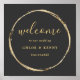 This wedding welcome sign features a faux gold circle frame and modern calligraphy with a grey background.