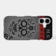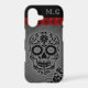 Gothic sugar skull on charcoal grey with red rose decoration and monogrammed in vintage font.