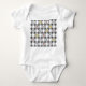 This baby bodysuit has a mid-century modern design of solid grey diamonds inside grey diamond outlines with baby objects on a field of white.