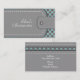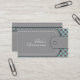 Grey leather look and pattern accessories business card template featuring two grey bands with seams and a button in leather style-not real leather just a PRINTED image and geometric pattern in grey and aqua blue.