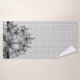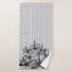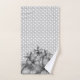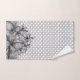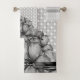 The bath and hand towels feature painted lilies in shades of grey with tendrils and leaves layered over a grey and white checked background. Your choice of text displays in a pretty white script over a semi-transparent horizontal band on the bath towel. The wash cloth has stripes in varying shades of grey over a checked background. Artwork and design by Karlajkitty