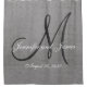 Personalised grey and white monogrammed shower curtain with bride and groom names and wedding date in a script font over design on a PRINTED grey linen photo effect background. Elke Clarke © for MonogramGallery at Zazzle. Makes a great gift for newly weds. Great trendy, elegant accessory for your bathroom. Customise with your names, monogram initial and wedding date.