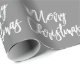 This elegant wrapping paper features the words "Merry Christmas" in brush font on a grey background.