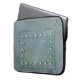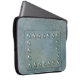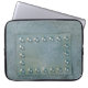 Grey metal with text plate on laptop sleeve