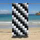 Black beach towel with a black, white and grey monochrome checked pixel mosaic pattern design.