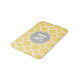 Chic, trendy, girly, Moroccan lattice quatrefoil pattern bath mat in yellow and white with a dark grey geometric circle label frame featuring a Monogram template.