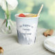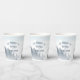 A mysterious grey forest accented with a romantic white fog around the pine trees and mountains in the background make a great wilderness wedding paper cup. The elegant reception decor features all caps with a beautiful signature flourish on the capital letters.
