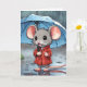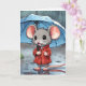 Cute grey mouse with red coat holding an umbrella in the rain for thinking of you.