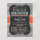 Bridal shower invitation with cute chalkboard look font on orange teal colours and warm grey paisley pattern. Vintage feel chalk fonts on cool blackboard background with ric rac design element.