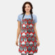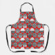This apron has a geometric design of ovals with different patterns in grey in each half all on a field of red.