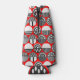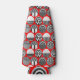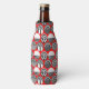 This bottle cooler has a geometric design of ovals with different patterns in grey in each half all on a field of red.